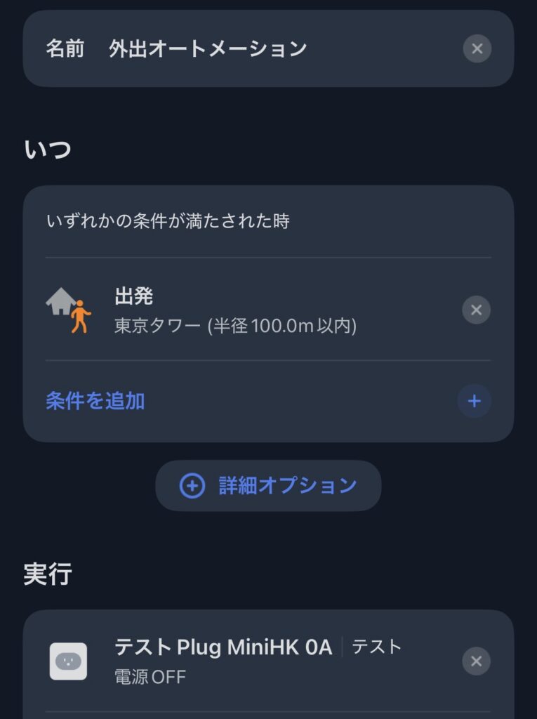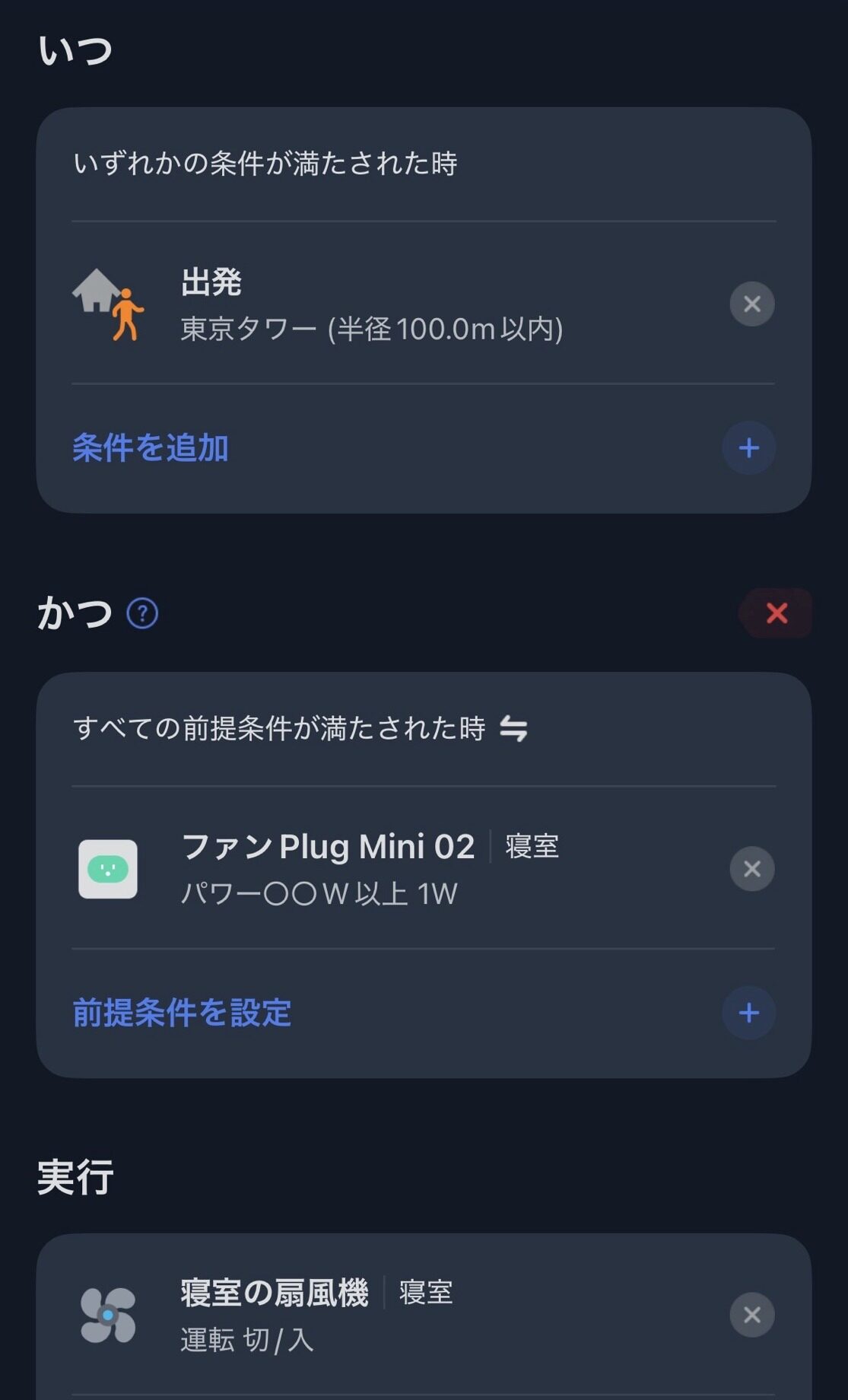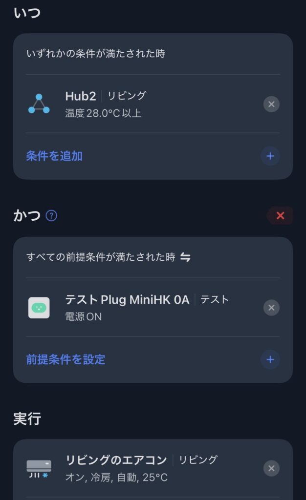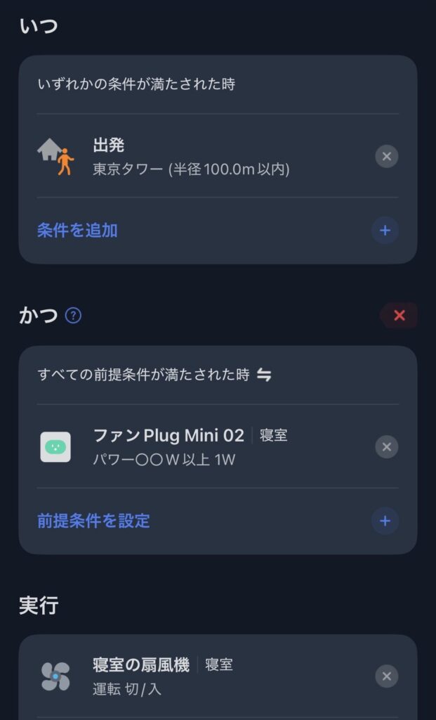なので、下記のようにプラグミニのオンオフ状態を外出在宅の判定に使用し、プラグミニのオンを先ほどのオートメーションの「かつ条件」に置き換えることで、在宅時だけオートメーションを実行することができます。