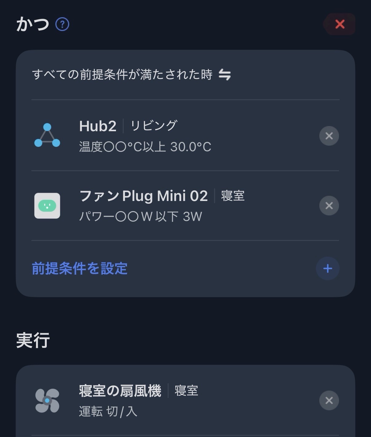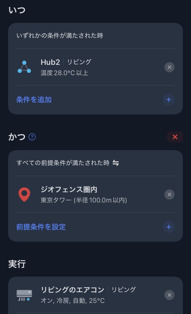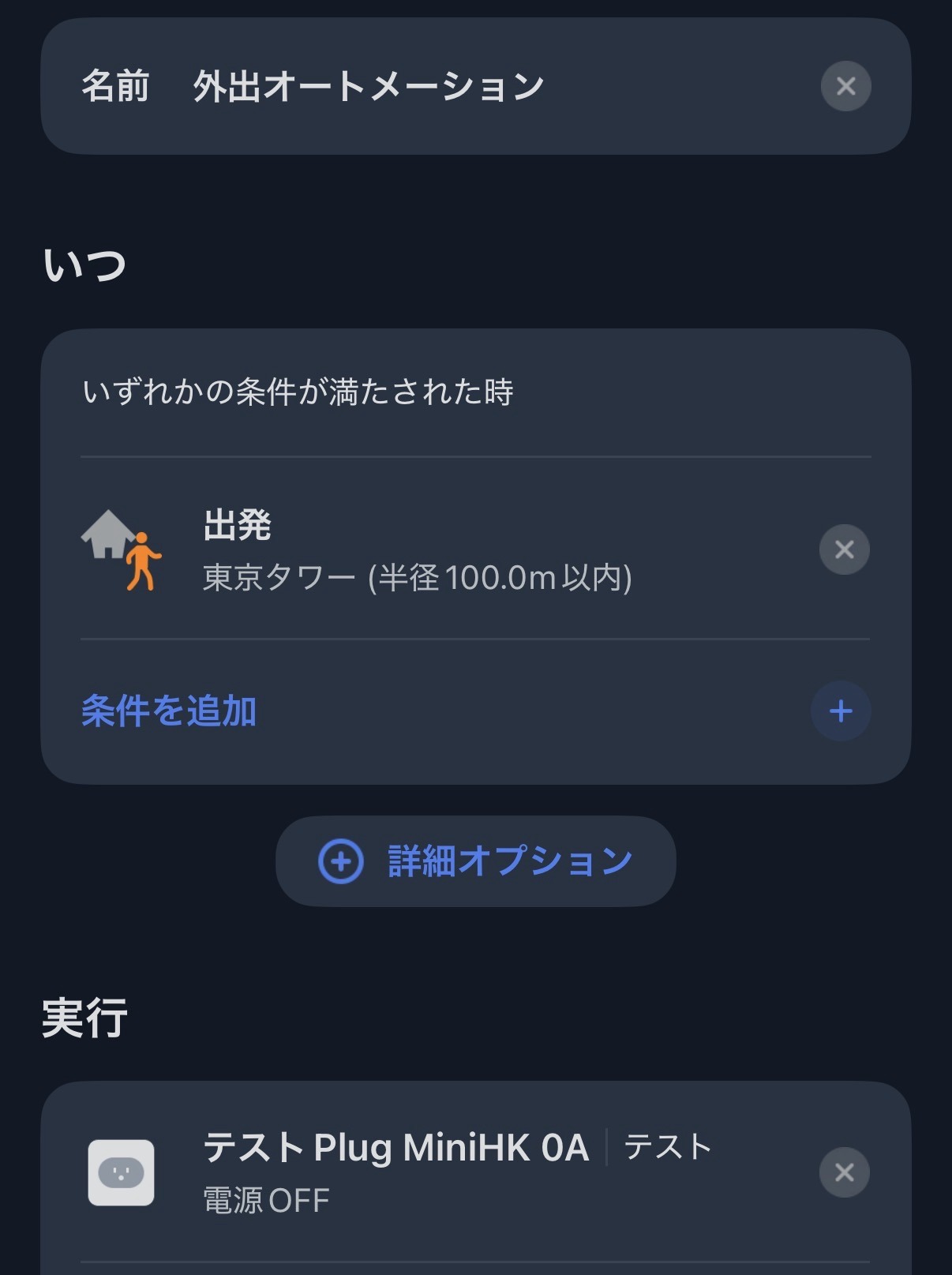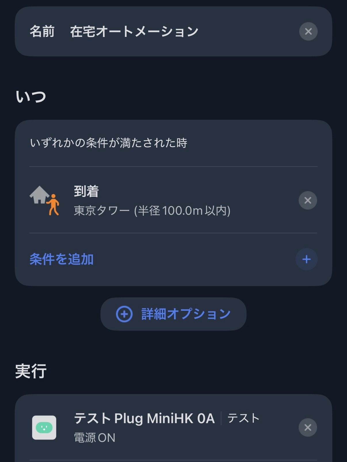 なので、下記のようにプラグミニのオンオフ状態を外出在宅の判定に使用し、プラグミニのオンを先ほどのオートメーションの「かつ条件」に置き換えることで、在宅時だけオートメーションを実行することができます。