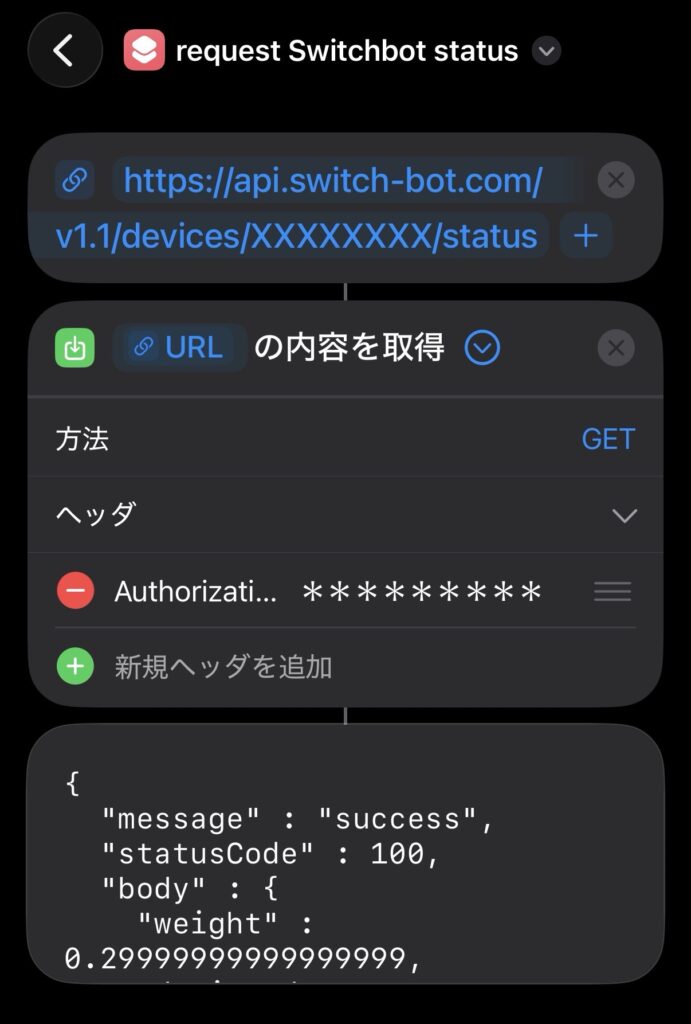 実際に使う際は、URL内の「XXXXXXXX」をプラグミニのデバイス情報から確認できるBLE MACの「:」を除いたもの、Authorizationで指定している「********」を先ほど取得したトークンに置き換えてください