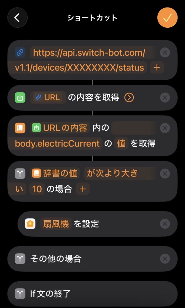 Switchbotのプラグミニはオートメーションで下記のように消費電力を確認したうえでオンオフを実行できます。