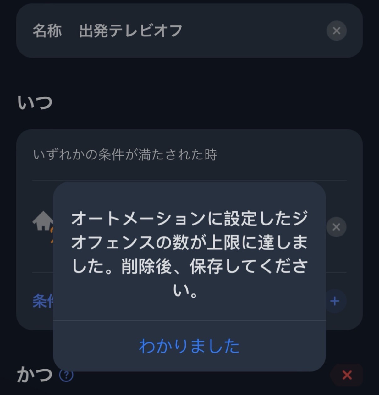 なので下記のような在宅時だけに実行したいオートメーションにも制限が適用されます。
